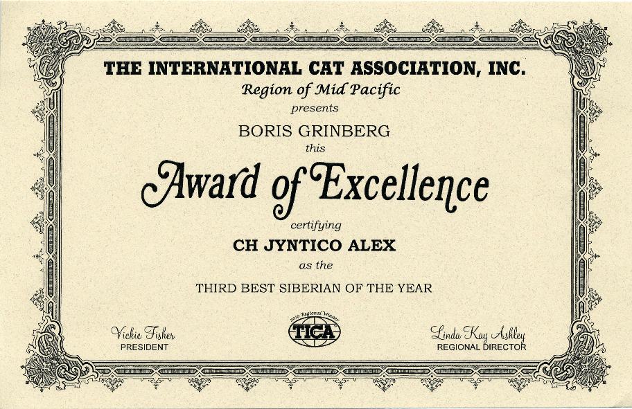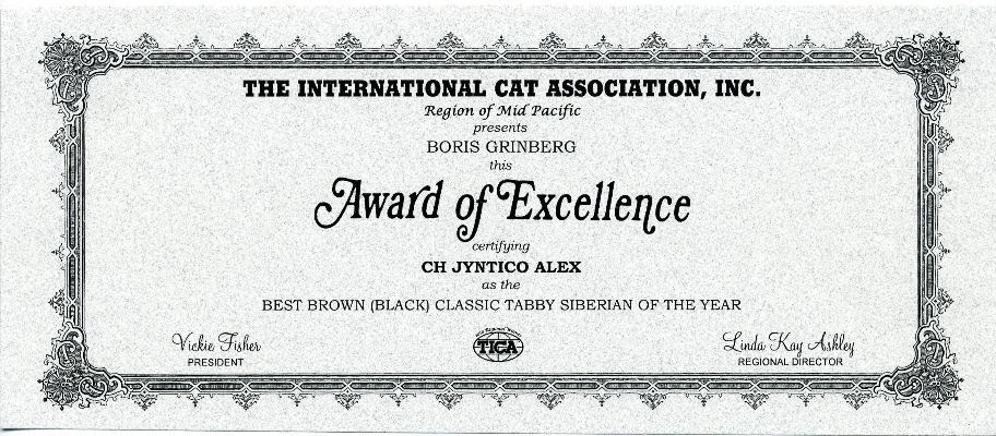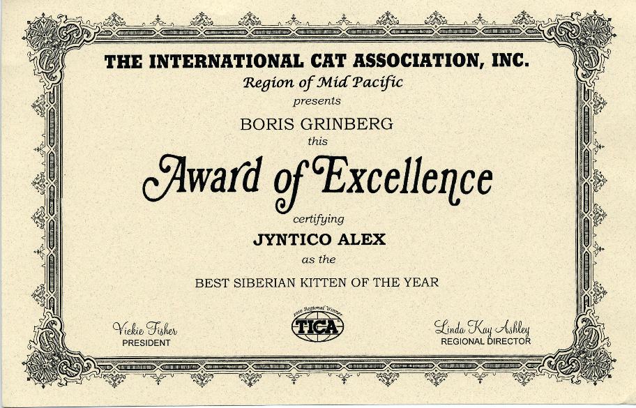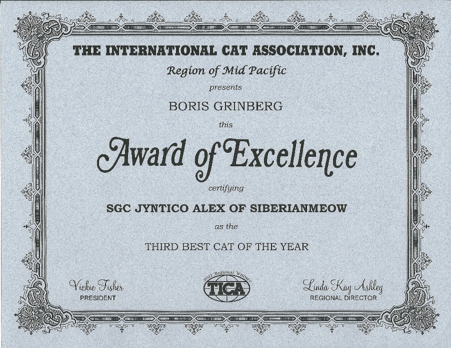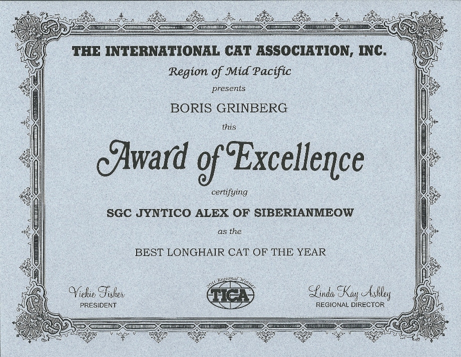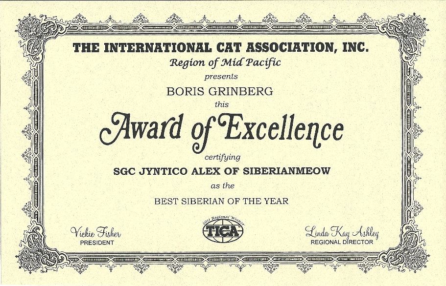 As we opened the official-looking yellow stamped envelope addressed to Boris from Linda Kay Ashley, who is a TICA judge and as we pleasantly found out is also the MP Regional Director, we did not know what to expect. The first award is pictured above, was awarded to Jyntico Alex the Siberian Meow Sire, in the previous show season when we first showed him as a kitten. The award states "Region of Mid Pacific presents Boris Grinberg this Award of Excellence certifying Jyntico Alex as the Best Siberian Kitten of the year". You can imagine our overwhelming surprise when we read the paper. Having the Best Siberian Kitten of the Year was amazing news! We knew we could expect a lot from our Siberian but this was mind-blowing! But that wasn't all! The following award amazed us even more...