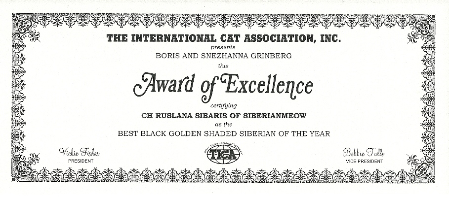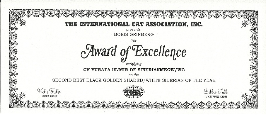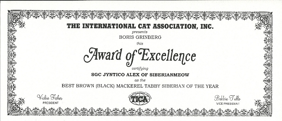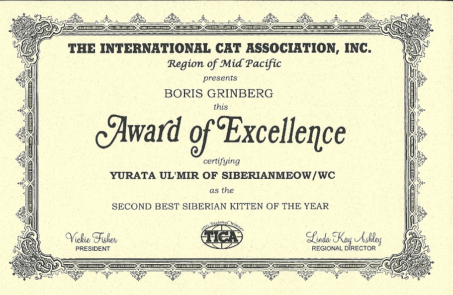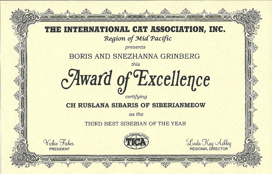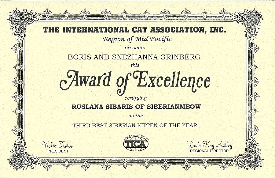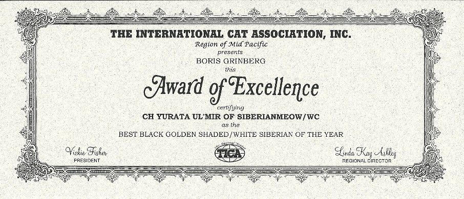 As we opened the official-looking yellow stamped envelope addressed to Boris from Linda Kay Ashley, who is a TICA judge and as we pleasantly found out is also the MP Regional Director, we did not know what to expect. The first award is pictured above, was awarded to Jyntico Alex the Siberian Meow Sire, in the previous show season when we first showed him as a kitten. The award states "Region of Mid Pacific presents Boris Grinberg this Award of Excellence certifying Jyntico Alex as the Best Siberian Kitten of the year". You can imagine our overwhelming surprise when we read the paper. Having the Best Siberian Kitten of the Year was amazing news! We knew we could expect a lot from our Siberian but this was mind-blowing! But that wasn't all! The following award amazed us even more...