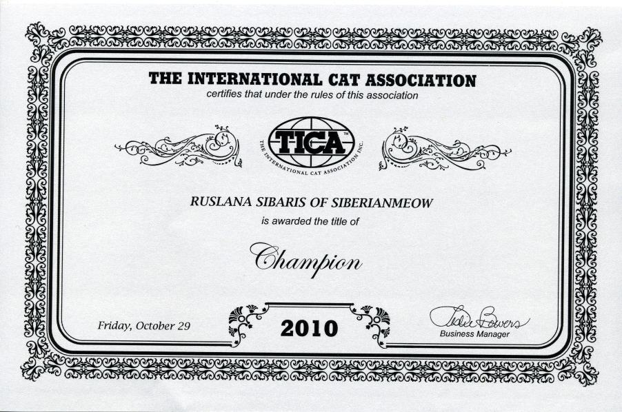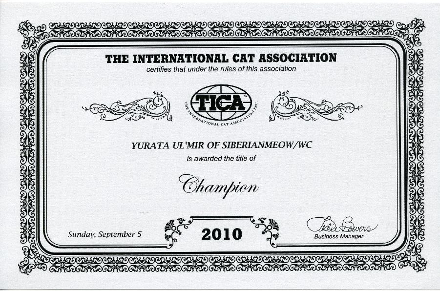 TICA awarded the above five titles to Jyntico Alex of Siberian Meow in recognition of his amazing job at cat shows. He is our beautiful Classic Brown (Black) Tabby Siberian boy and our Sire. Alex is a natural born for shows. From the very first show at Fog City Club he acted like a professional. He remained cool, calm and collected living up to his Siberian personality and traits. The proud "I'm-above-you-all-look" he threw to the audience from the judging cages made us wonder if he had done this before in a previous lifetime. We knew Siberians have good showmanship but this was almost ridiculous! As a family we had not properly even had time to enjoy these achievements when the next set of achievements came in today (7-19-10) in the mail! First title has been added to the name: from Jyntico Alex of SiberianMeow to CH Jyntico Alex of SiberianMeow !
