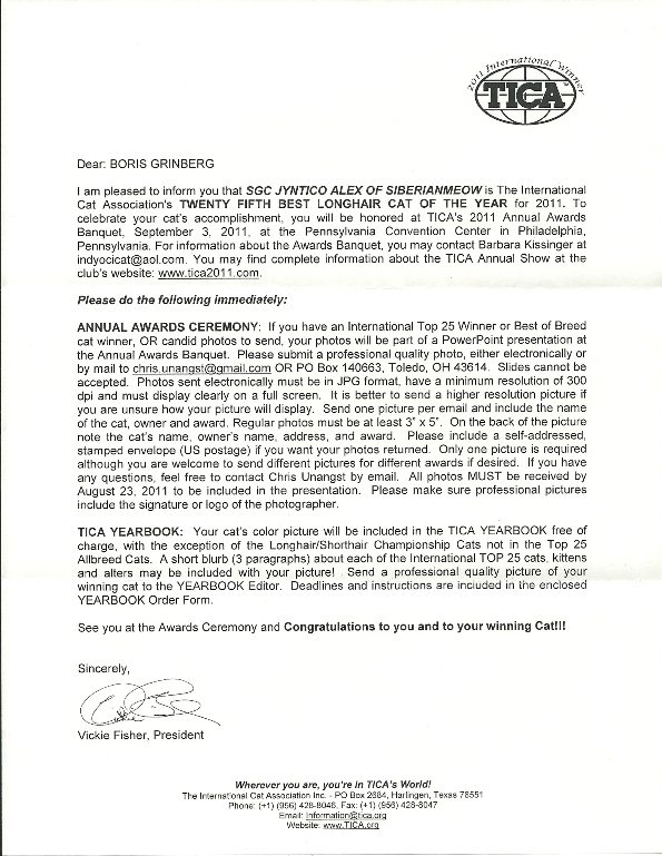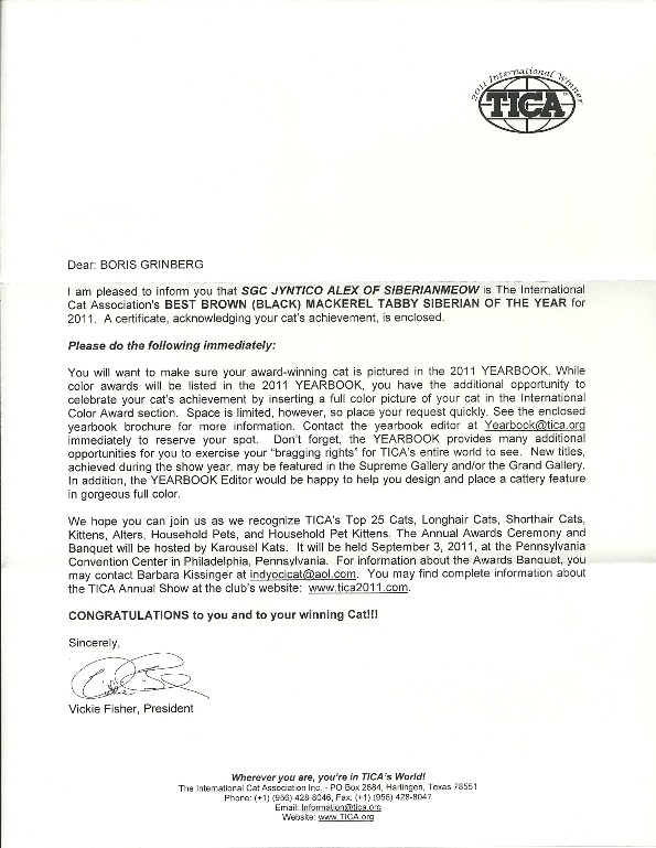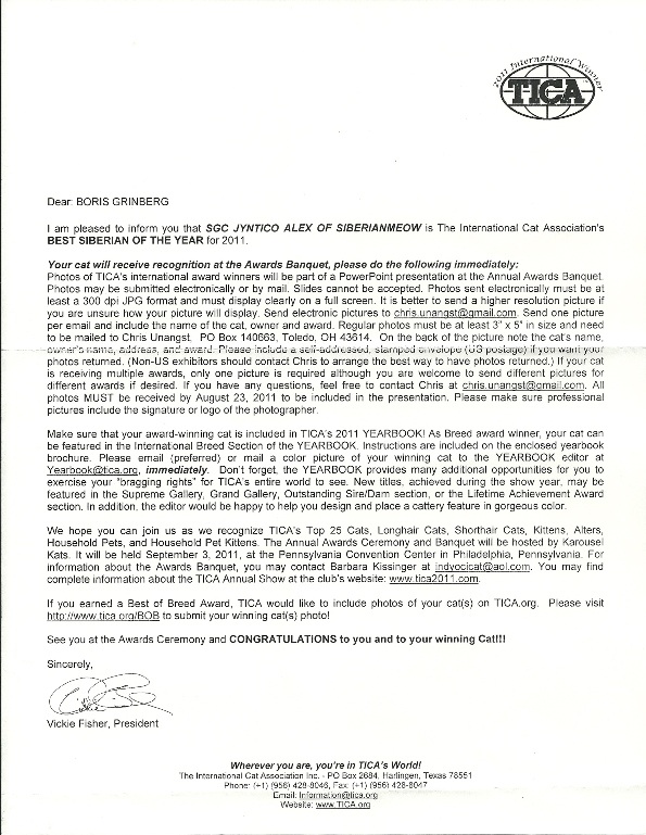 As you probably already read on the paper, Champion Jyntico Alex was certified as the Third Best Siberian of the Year, also for the previous show season. First he was awarded Best Siberian Kitten and now this?! What more could we expect, but while we were having a mini-party and celebrating our little (or should I say big? As he is now pushing 14 lbs) Siberian boy a third paper dares to fall out of the yellow envelope and mar our beautifully finished hardwood floor! We take a closer look...